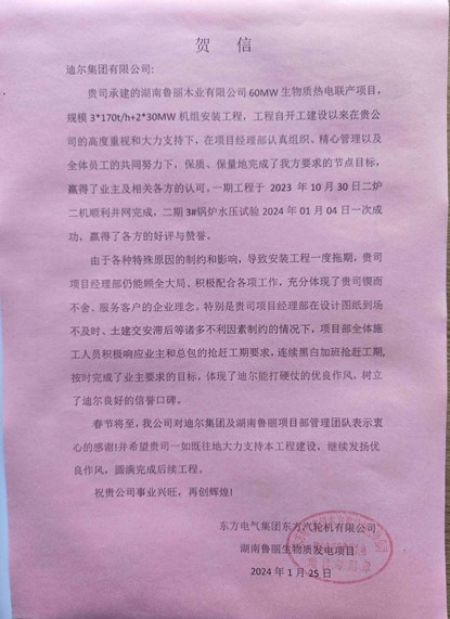 2024年元月25日,東方電氣集團東方汽輪機有限公司向第四公司魯麗項目部發(fā)來(lái)了賀信。東汽項目經(jīng)理楊海濤為迪爾集團第四公司魯麗項目部頒發(fā)了“鐵軍風(fēng)采,使命必達”榮譽(yù)證書(shū)。