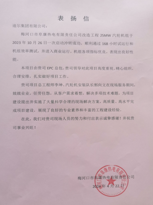 4月22日,梅河口市阜康熱電有限責任公司對山東工程設計院負責設計、施工的梅河口市阜康熱電4號汽輪機低碳節能技改EPC總承包項目給予高度肯定,并發(fā)來(lái)表?yè)P信。