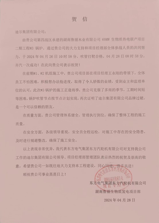 湖南魯麗木業(yè)有限公司60MW生物質(zhì)熱電聯(lián)產(chǎn)項目二期工程3#鍋爐于2024年4月26日10時(shí)58分吹管打靶合格,4月28日08時(shí)58分并汽一次成功??偘綎|方電氣集團東方汽輪機有限公司給項目部發(fā)來(lái)了賀信。