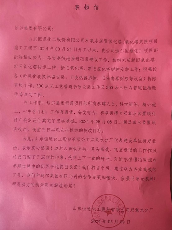 為此,山東恒通化工股份有限公司雙氧水分廠(chǎng)代表建設單位特發(fā)此函,表示衷心感謝!迪爾人積極主動(dòng)、務(wù)實(shí)高效、銳意進(jìn)取的工作作風(fēng)給我們留下了深刻的印象,受到上下一致的好評。對迪爾恒通項目部在參建過(guò)程中的優(yōu)異表現提出表?yè)P!我們相信今后,通過(guò)雙方務(wù)實(shí)高效的工作,我們和迪爾集團有限公司的合作會(huì )更加愉快、前景將更加寬闊!祝愿雙方的明天更加輝煌燦爛!