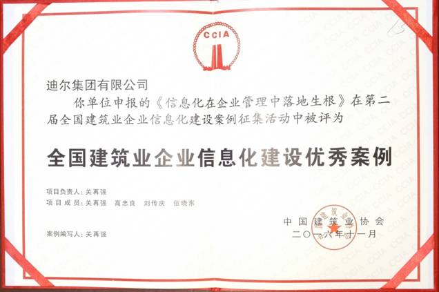 公司申報的《信息化在企業(yè)管理中落地生根》在第二屆全國建筑企業(yè)信息化建設案例征集活動(dòng)中被評為:全國建筑企業(yè)信息化建設優(yōu)秀案例。