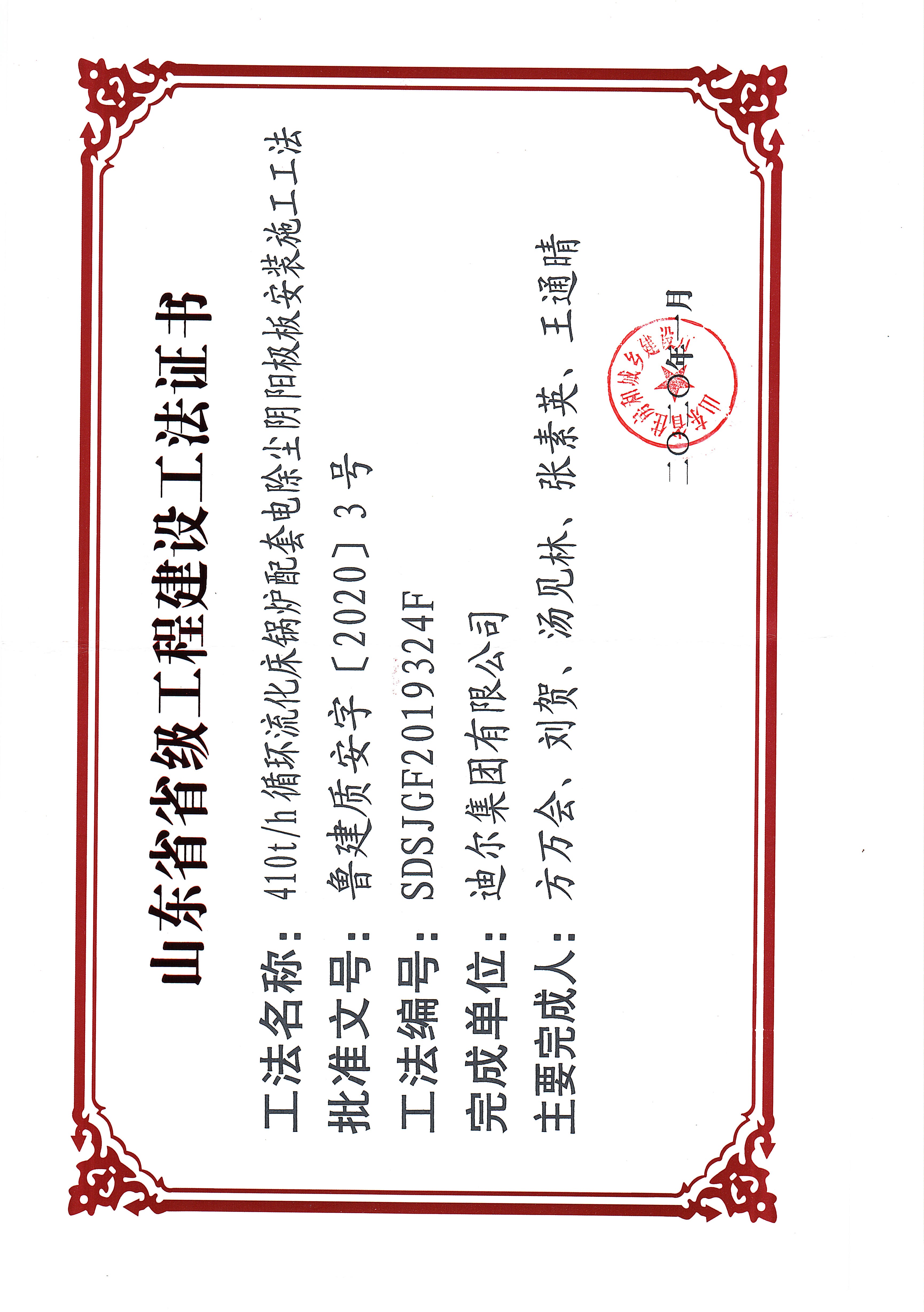 公司榮獲山東省省級“410th循環(huán)流化床鍋爐配套電除塵陰陽(yáng)極板安裝施工工法”