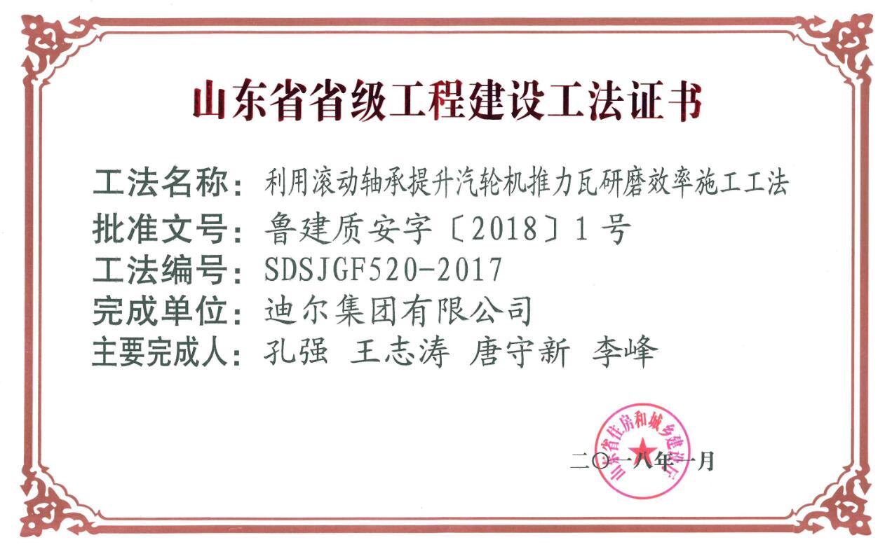 公司榮獲山東省省級“利用滾動(dòng)軸承提升汽輪機推力瓦研磨效率施工工法”