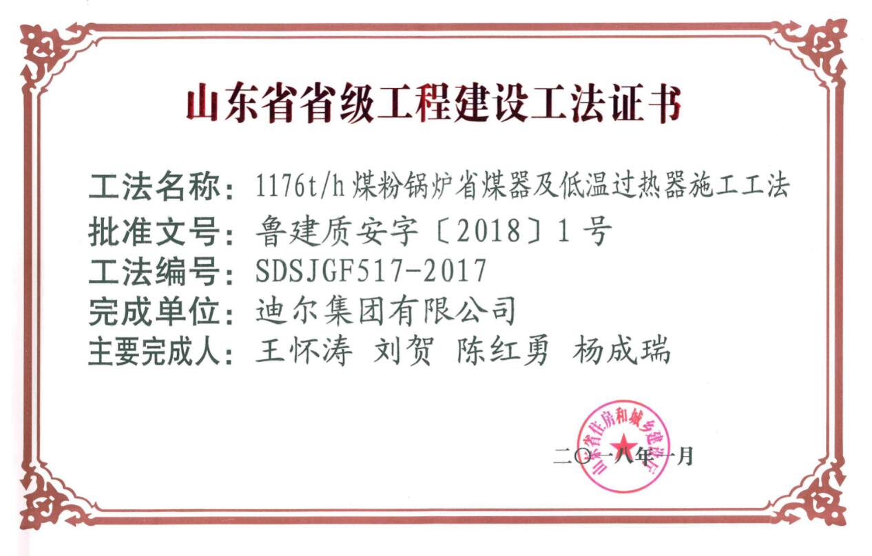 公司榮獲山東省省級“1176th煤粉鍋爐省煤器及低溫過(guò)熱器施工工法”