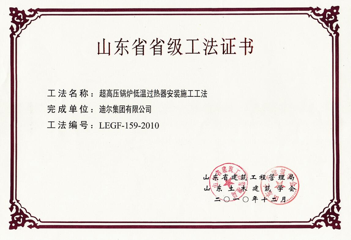 公司榮獲山東省省級“超高壓鍋爐低溫過(guò)熱器安裝施工工法”