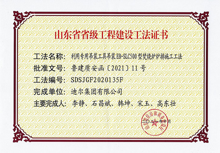 公司榮獲省級施工工法“利用專(zhuān)用吊裝工具吊裝EB-SLC500型焚燒爐爐排施工工法”