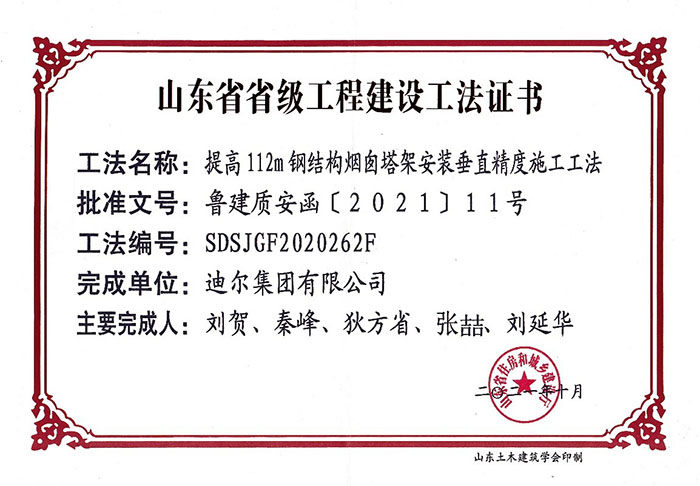 公司榮獲省級施工工法“提高112m鋼結構煙囪塔架安裝垂直精度施工法”