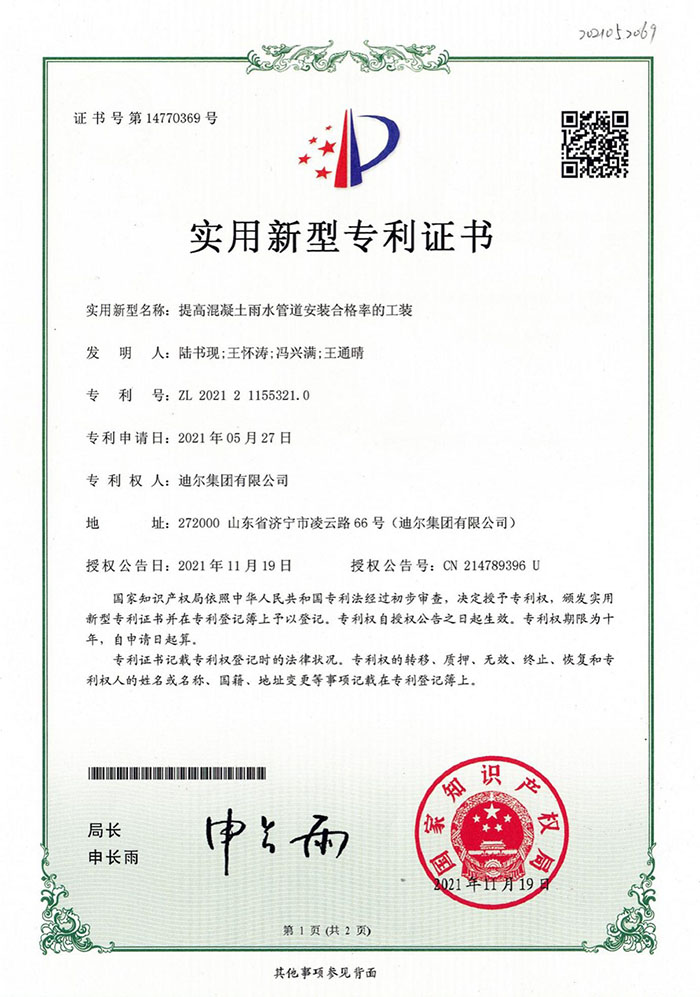 公司榮獲“提高混凝土雨水管道安裝合格率的工裝”實(shí)用新型專(zhuān)利