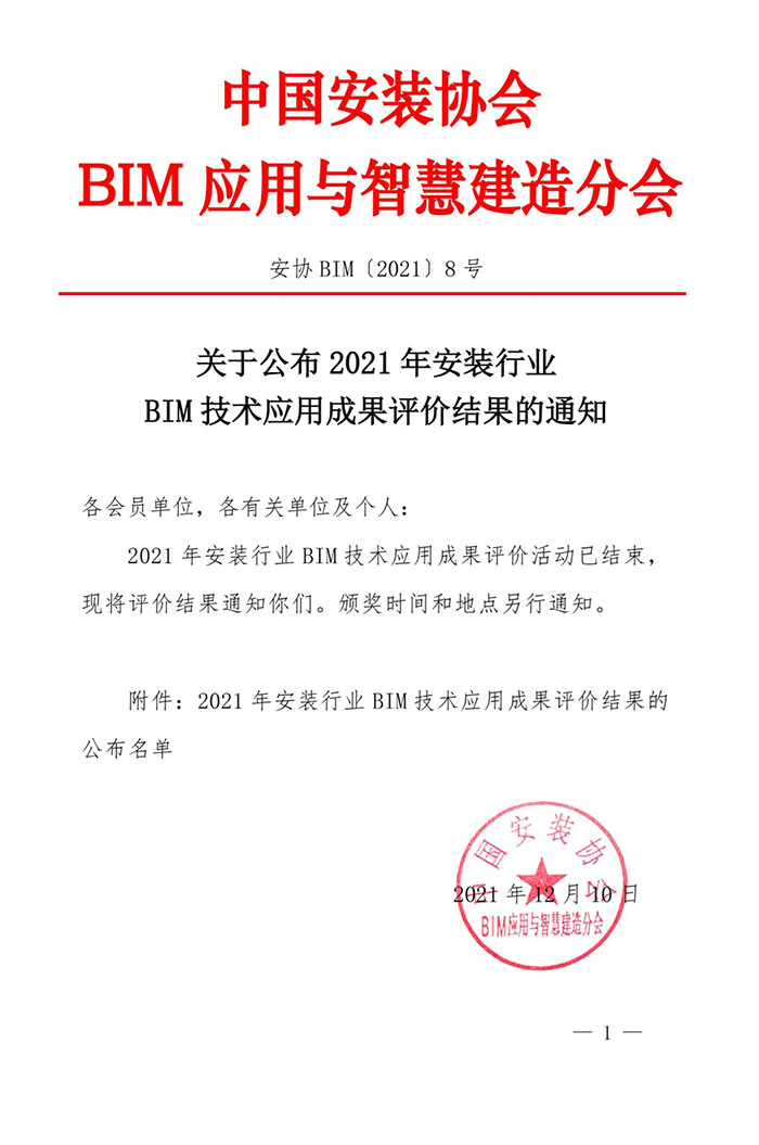 公司BIM成果榮獲安裝行業(yè)BIM技術(shù)應用成果“國內領(lǐng)先(I類(lèi))”評價(jià)