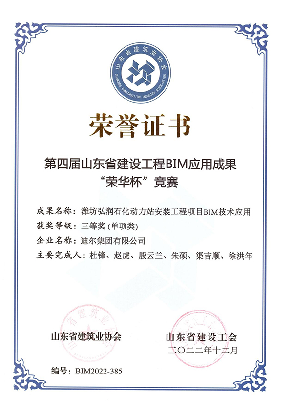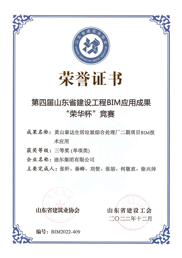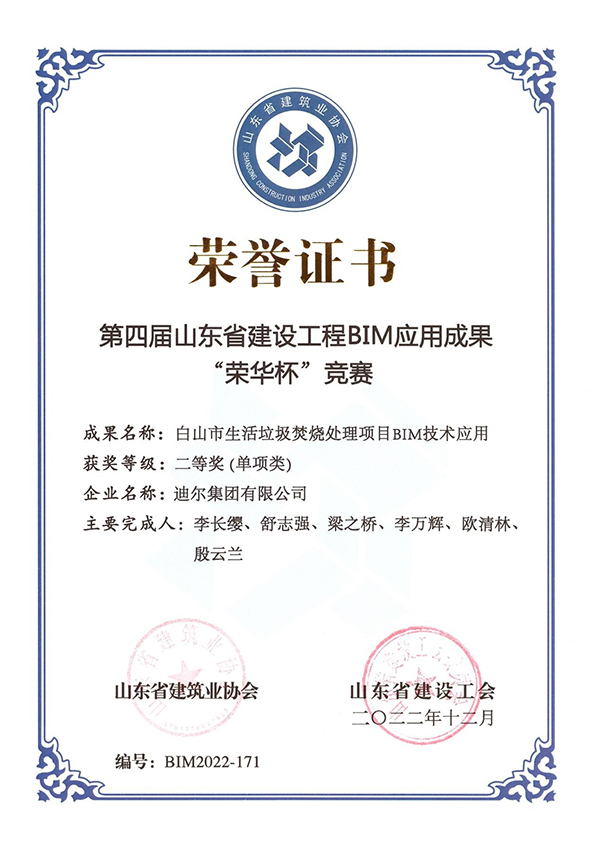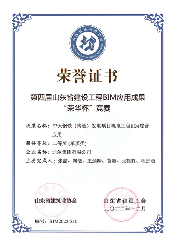 近日,由山東省建筑業(yè)協(xié)會(huì )、山東省建設工會(huì )聯(lián)合主辦的第四屆山東省建設工程BIM應用成果“榮華杯”競賽結果評獎揭曉,迪爾集團有限公司經(jīng)專(zhuān)家評審、終評答辯和公示等環(huán)節,最終獲得二等獎2項、三等獎2項的優(yōu)異成績(jì)