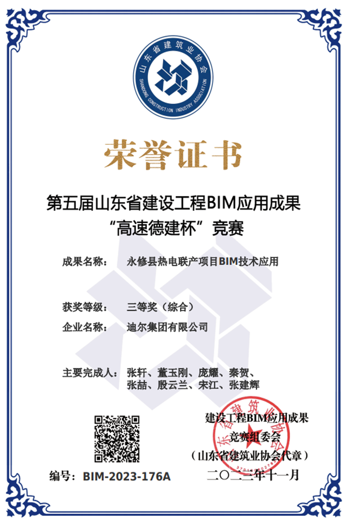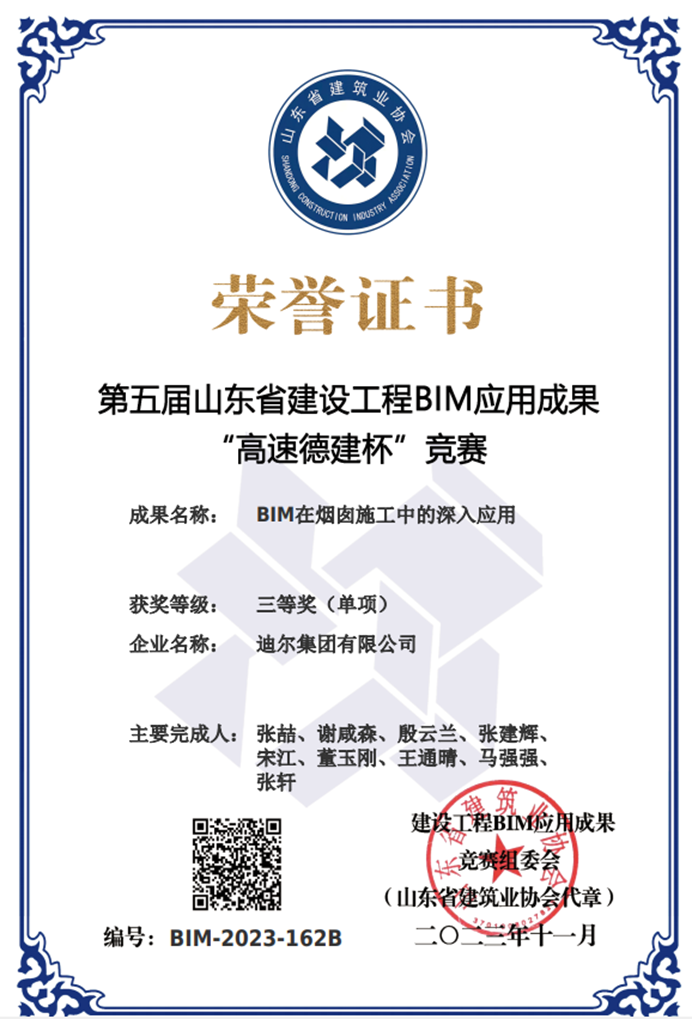 由山東省建筑業(yè)協(xié)會(huì )、山東省建設工會(huì )聯(lián)合主辦的第五屆山東省建設工程BIM應用成果“高速德建杯”競賽結果評獎揭曉,迪爾集團有限公司經(jīng)專(zhuān)家評審、終評答辯和公示等環(huán)節,最終獲得三等獎3項。